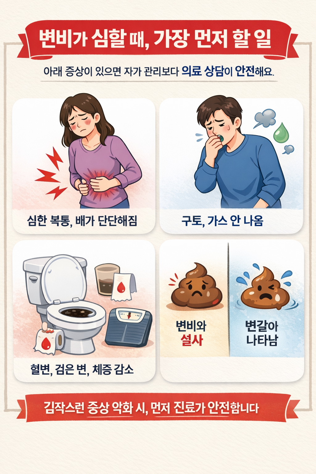 변비가 심할때 가장 먼저 해야 할 일은 지금 당장 병원 상담이 필요한 상황인지 확인하는 거예요. 아래 항목이 하나라도 해당되면 자가 관리보다 의료진 상담이 안전해요.