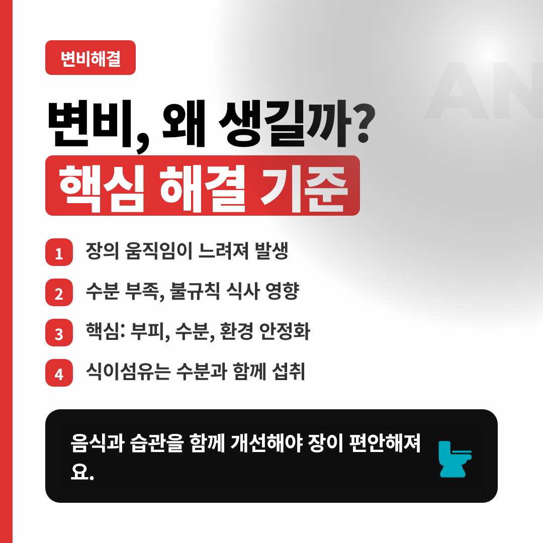 변비는 장의 움직임이 느려져 대변이 장 안에 오래 머무는 상태에서 자주 시작돼요. 머무는 시간이 길어질수록 수분이 더 흡수되어 대변이 단단해지고 배출이 어려워지기 쉬워요. 여기에 활동량이 적고 물 섭취가 부족하며 식사가 불규칙하면 장 리듬이 쉽게 깨져요.