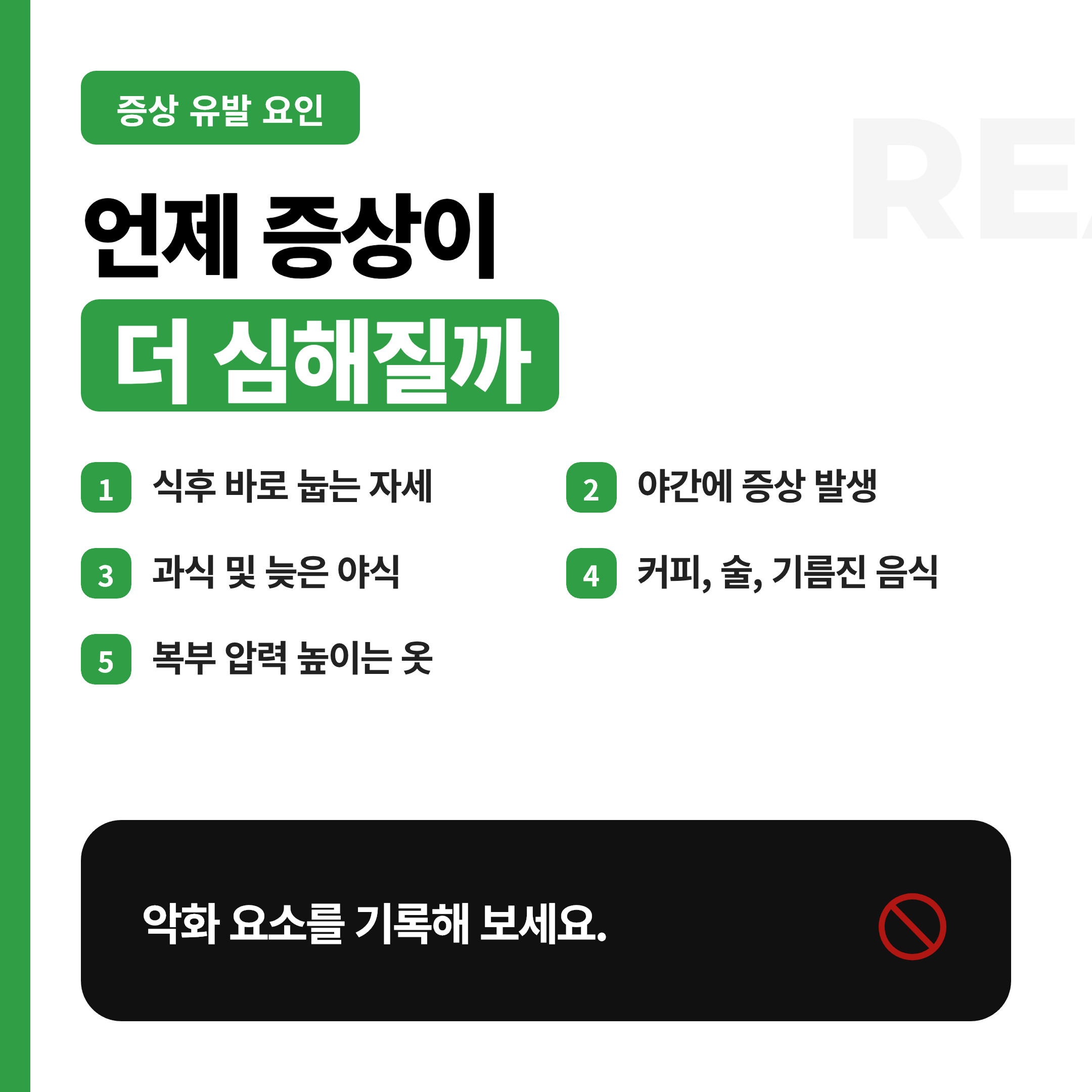 - 식후, 야간, 눕는 자세에서 더 심해지면 가능성이 높아요