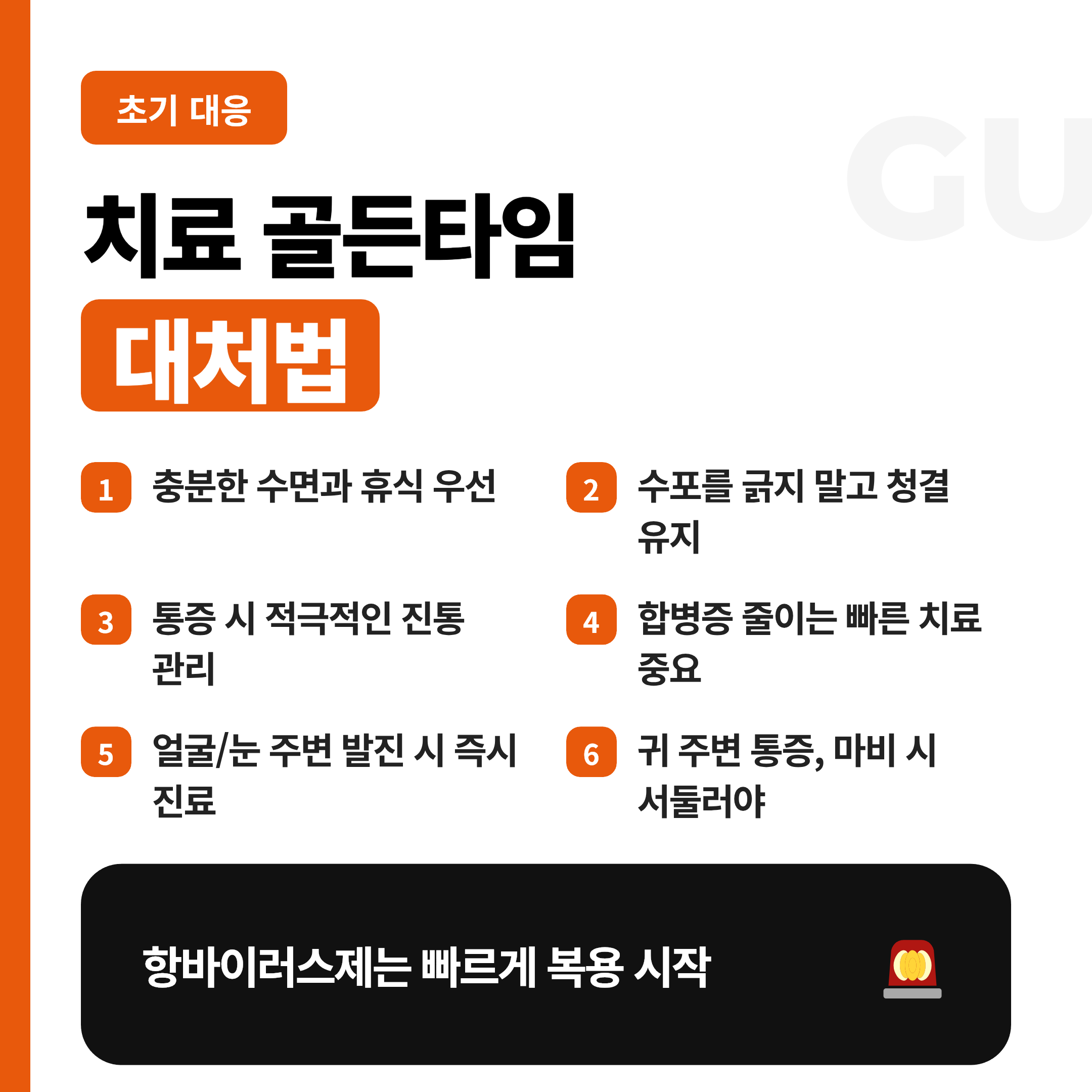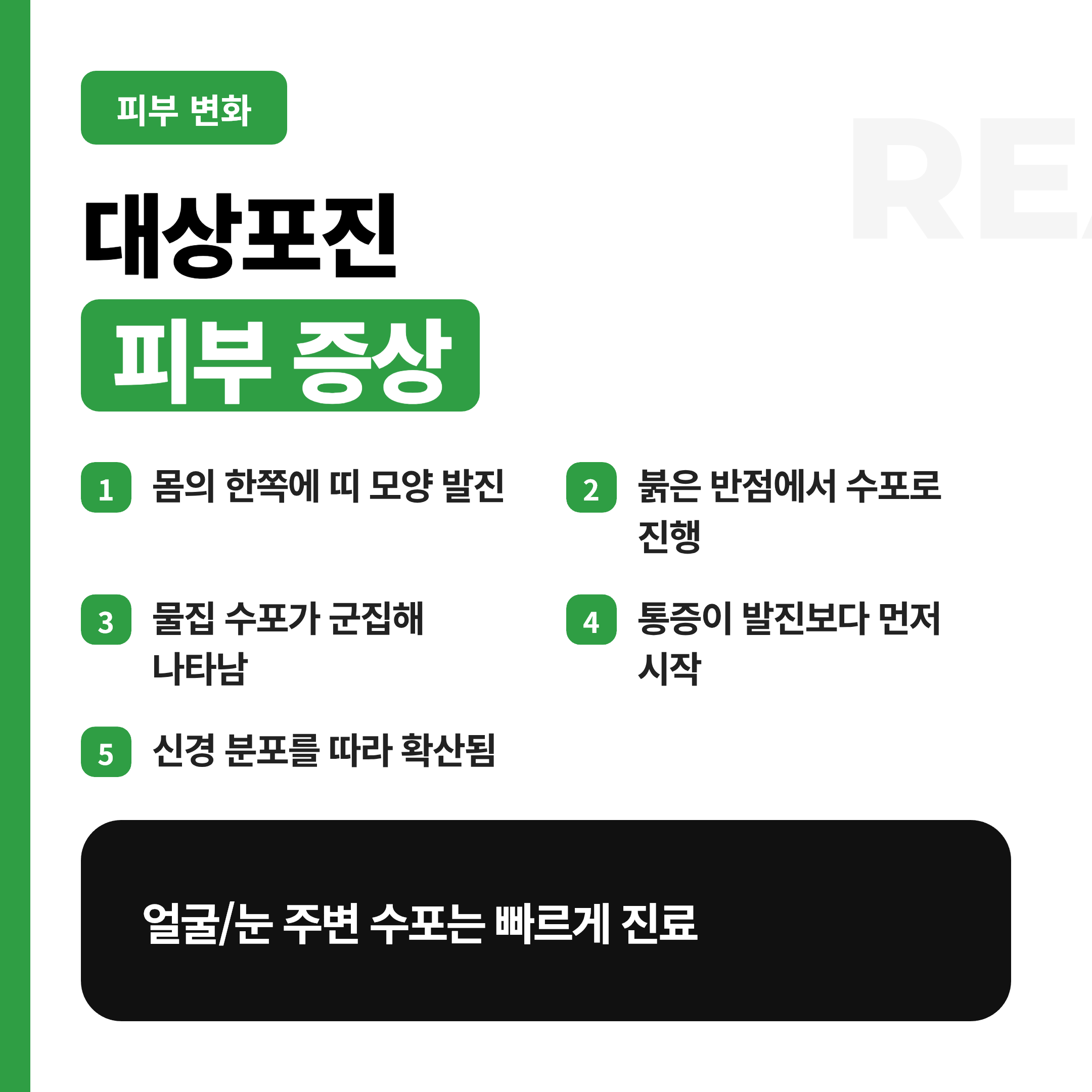 - 얼굴, 눈 주변, 귀 주변 통증이나 발진은 합병증 위험이 있어 빠른 진료가 중요해요